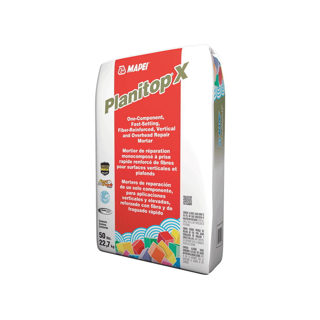 MAPEI Planitop X est un mortier de réparation cimentaire monocomposé en couche épaisse, renforcé de fibres, modifié aux polymères, à prise rapide, à résistance initiale élevée et à retrait compensé, avec inhibiteur de corrosion.